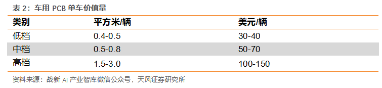 PCB單車價(jià)值量目前不高,預(yù)計(jì)未來有望隨汽車新四化的推動不斷提升。根據(jù)戰(zhàn)新AI產(chǎn)業(yè)智庫的數(shù)據(jù),截止2019年7月,低檔、中檔和高檔汽車單臺PCB的價(jià)值分別為30-40美元、50-70美元和100-150美元。我們預(yù)計(jì)未來隨著汽車新四化的不斷推進(jìn),單車PCB的價(jià)值量有望持續(xù)提升。