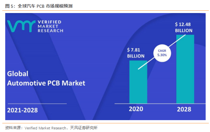全球汽車PCB市場持續(xù)保持增長。根據(jù)Verified Market Research預(yù)測,2021-2028年汽車PCB市場將保持增長,區(qū)間CAGR為5.30%。市場規(guī)模將由2020年78.1億美金提升至2028年124.8億美金。