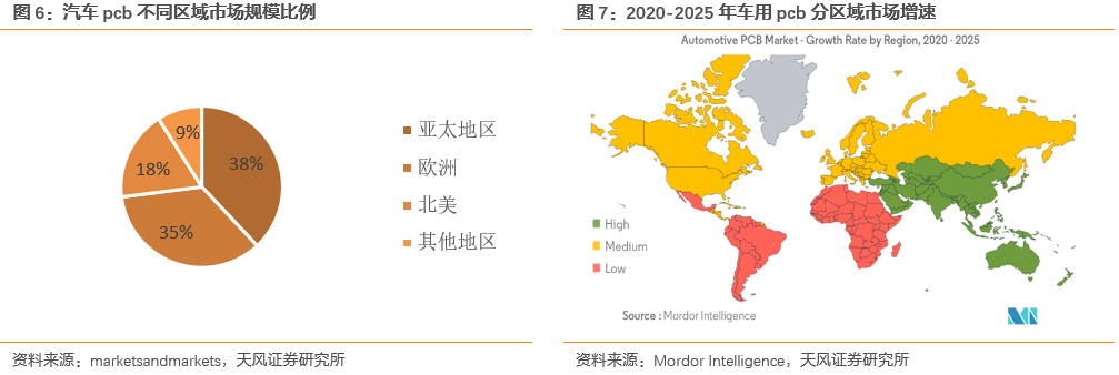 亞太地區(qū)是規(guī)模最大市場,同時(shí)是增長最快的市場。分區(qū)域來看,亞太地區(qū)車用PCB市場規(guī)模位列全球首位,占據(jù)全球38%的市場份額,同時(shí)根據(jù)Mordor Intelligence的預(yù)測,未來亞太地區(qū)市場將成為增速最高的市場。其中我們認(rèn)為,中國市場也將成為快速增長,充滿機(jī)遇的市場。
