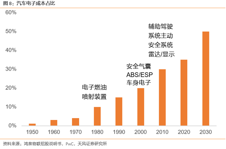 汽車電子在整車中成本占比逐漸提升。汽車電子滲透率不斷提升,電子化趨勢明顯。預(yù)計(jì)2030年達(dá)到50%左右滲透率。汽車電子成本占比提升主要源于: