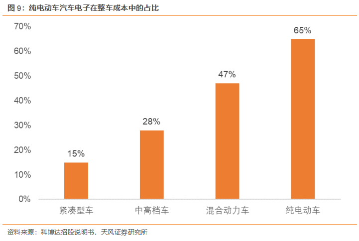 新能源汽車新趨勢帶動汽車電子占比進(jìn)一步快速提升。新能源車汽車電子占比更高。汽車電子在整車成本中的占比不盡相同,其中在緊湊型乘用車成本中的占比達(dá)到 15%,中高端乘用車占比達(dá) 28%,混合動力乘用車占比達(dá) 47%,純電動乘用車占比達(dá) 65%。