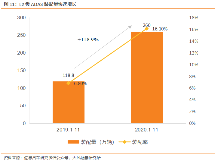 ADAS滲透率持續(xù)提升,未來預(yù)計(jì)裝配量仍將持續(xù)增長。根據(jù)佐思汽研的數(shù)據(jù),2020年1-11月份配備L2級自動駕駛功能的乘用車上險(xiǎn)量260.0萬輛,同比增長118.9%;裝配率16.1%,比上年同期增加9.3個(gè)百分點(diǎn)。盡管受多重負(fù)面影響,L2裝配量實(shí)現(xiàn)逆勢上漲,市場表現(xiàn)出需求強(qiáng)勁。