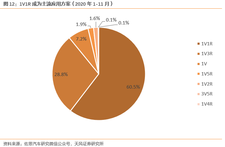 自動駕駛驅(qū)動攝像頭與雷達(dá)需求,1V1R目前為主流應(yīng)用。根據(jù)佐思汽研的數(shù)據(jù),2020年1-11月,L2級功能的主流方案有1V1R(1攝像頭+1前向毫米波雷達(dá))、1V3R(1攝像頭+1前向毫米波雷達(dá)+2后角雷達(dá))兩種,合計(jì)市場占比到89.3%,其中1V1R方案占比最大,為60.5%。造車新勢力以及部分車企采用了2后角雷達(dá),預(yù)計(jì)未來攝像頭與毫米波/激光雷達(dá)的應(yīng)用量將增加。