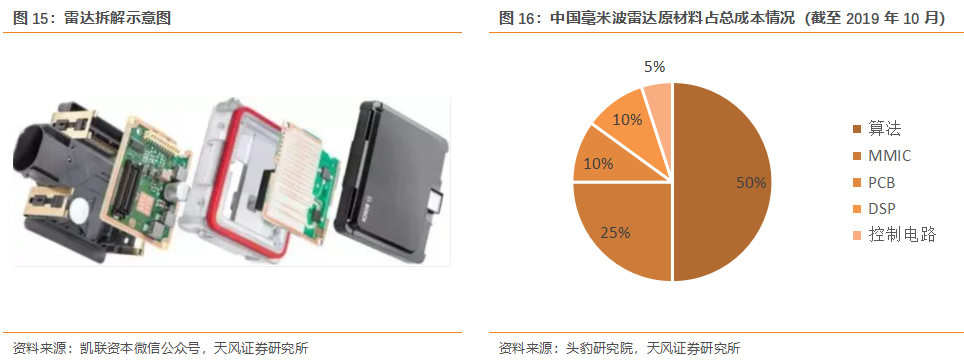 毫米波雷達(dá)基于PCB構(gòu)成。毫米波雷達(dá)的構(gòu)成中包括控制電路、DSP、算法、PCB等,PCB為其中的基礎(chǔ)支撐,對于毫米波雷達(dá)的性能具有重要的影響。根據(jù)頭豹研究院數(shù)據(jù),截至2019年10月,中國毫米波雷達(dá)成本構(gòu)成中,PCB占約10%的比例。