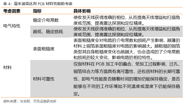 77GHz毫米波雷達(dá)對于PCB要求提升,帶動PCB價(jià)值量提升。在毫米波雷達(dá)中PCB對其性能具備一定影響,所以對于PCB的性能要求隨之提升。包括材料的電氣特性、材料的可靠性方面需要有嚴(yán)格的考量,以提高天線增益和掃描角度或范圍,滿足雷達(dá)探測和定位精度以及保證在不同的工作環(huán)境如不同溫度或濕度下仍能保持穩(wěn)定。