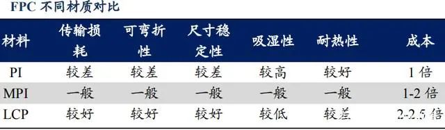 MPI易加工生產(chǎn),各項性能適中。LCP性能最優(yōu),但生產(chǎn)加工復雜、良品率低、供應廠商少,且價格昂貴。