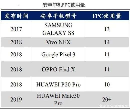 在蘋果公司的引領下,安卓系手機也在持續(xù)跟進,三星手機的單機FPC用量約為13片,國內(nèi)高端機型華為、OPPO、VIVO 等的單機FPC用量約10-14片左右,與蘋果機型相比還有較大的成長空間。預計安卓系手機FPC用量還有一倍以上提升空間,未來有望帶動 FPC高速增長。
