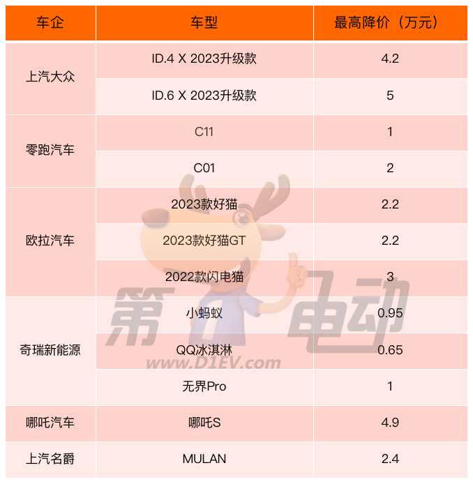 最高降價5萬元 10家車企加入“降價”陣營8月1日,上汽大眾率先打響降價潮的第一槍。也許是為了延續(xù)7月份ID.3帶來的火熱勢頭,上汽大眾旗下多款車型推出限時優(yōu)惠。在8月1日至8月31日期間,上汽大眾旗下包括途昂、途觀家族以及ID.4 X和ID.6 X等9款SUV車型迎來降價,至高優(yōu)惠6萬元。同樣是8月1日,零跑汽車在宣布7月交付量之前提前釋放一個重磅信息——C11和C01兩款車型旗下部分型號價格下調(diào)最高兩萬元。這是距離今年3月份官宣降價后,零跑再度官宣降價。