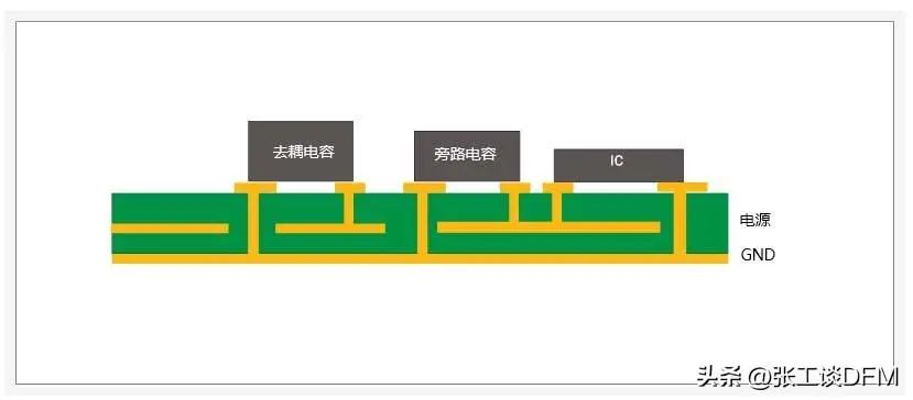旁路電容旁路噪聲并減少電源總線的波動,放置在靠近設(shè)備或者IC的位置。連接在電源和接地之間,補(bǔ)償許多IC同時開關(guān)電源和接地層電勢的變化。