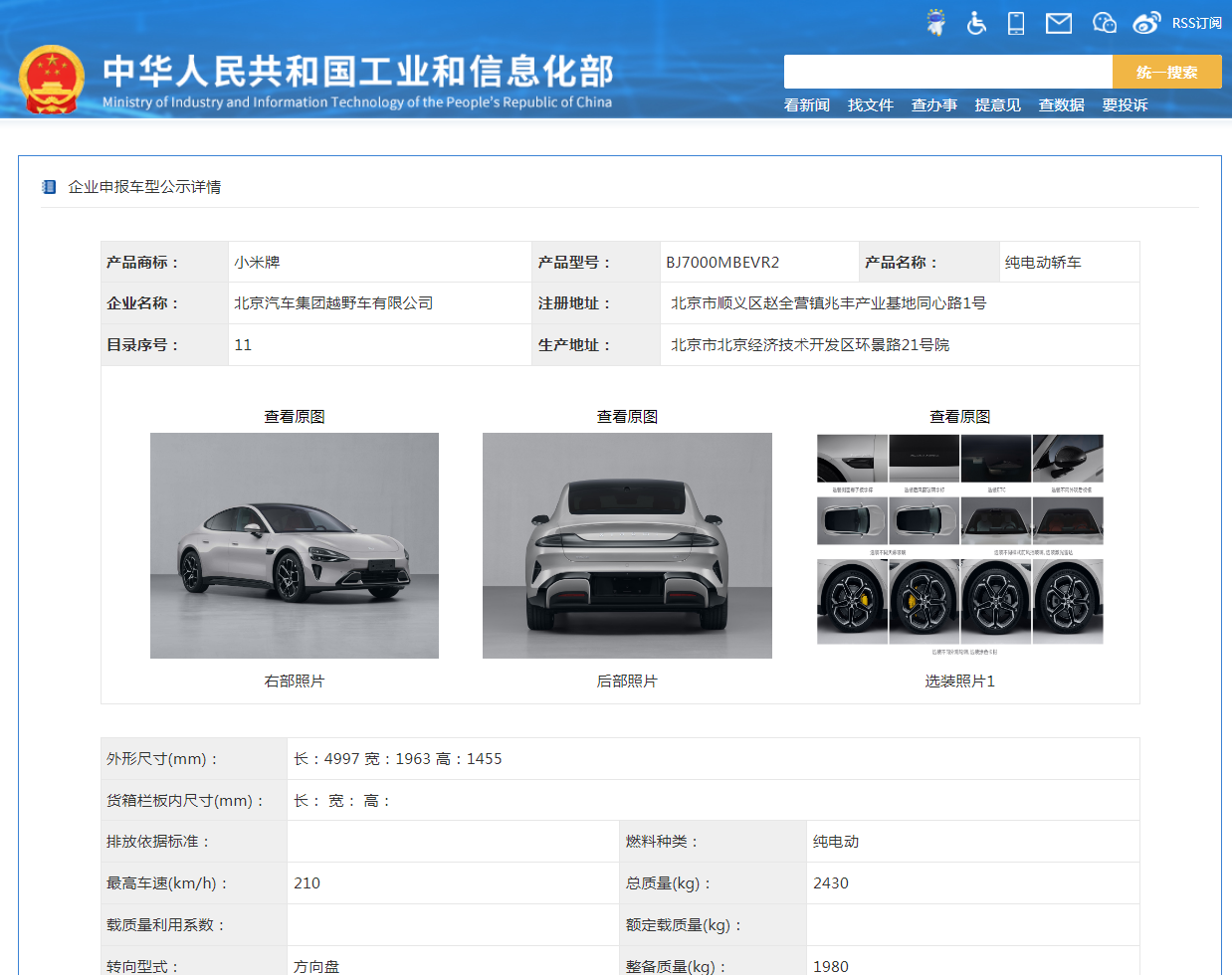 公告顯示,名單中有兩款小米牌純電動轎車,型號分別為BJ7000MBEVA1、BJ7000MBEVR2,企業(yè)名稱為北京汽車集團越野車有限公司。這也意味著,北汽越野車公司成為小米汽車的代工方。北汽越野車公司系北京汽車集團有限公司全資子公司,實際控制人為北京市國資委。