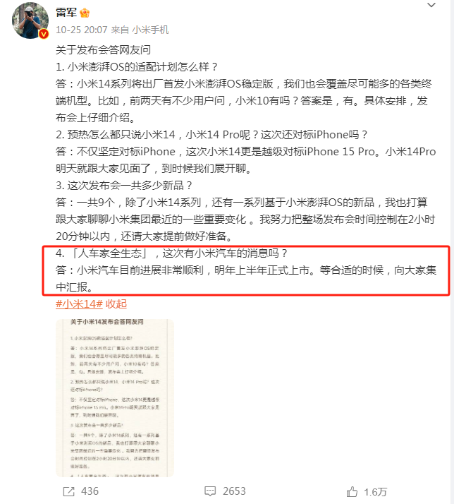 10月25日,小米集團創(chuàng)始人、董事長兼CEO雷軍在微博透露,小米汽車進展順利,將在2024年上半年正式上市。