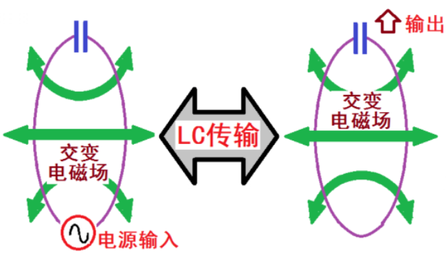 圖中的能量以磁場(chǎng)形式進(jìn)行無(wú)線傳輸,相當(dāng)于一個(gè)隔離變壓器實(shí)現(xiàn)了無(wú)線充電,形成電源發(fā)送端和能量接收端。