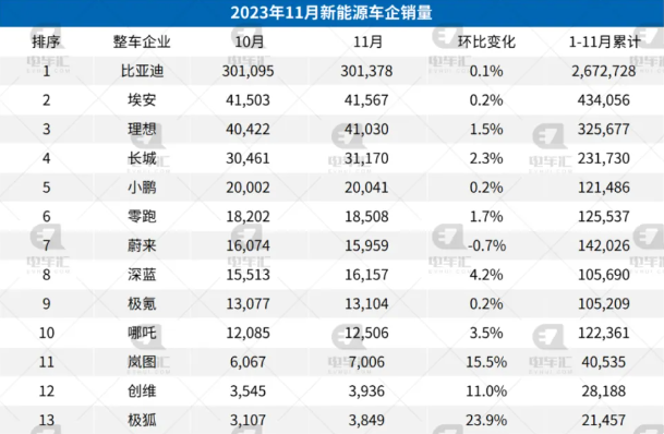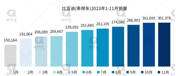 比亞迪11月新能源乘用車銷量301,378輛,同比增長31%,環(huán)比上月增加了283輛。1-11月累計銷量2,672,728輛,同比增長65%。今年前11個月比亞迪集團新能源汽車?yán)塾嬩N量268.3萬輛,距離全年300萬輛的目標(biāo)還有近32萬輛。