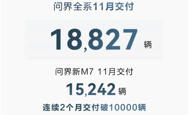 其中問界11月交付新車18,827輛,問界新M7交付1,5242輛,上市以來該車?yán)塾嫿桓?7,000輛,而截至日前大定量已超10萬輛。