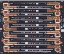 型 號(hào):RM01C00187A層 數(shù):1板 厚:0.12mm材 料:?jiǎn)蚊嬗心z電解銅 厚:1/2 OZ表面處理:沉金2微英寸最小線寬/線距:0.1mm/0.08mm特 點(diǎn):外形復(fù)雜