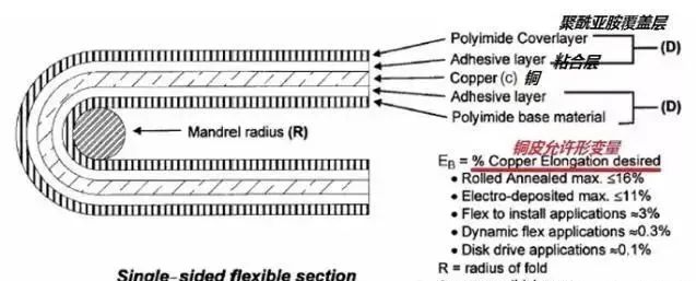 其中:R=最小彎曲半徑、單位µm、c=銅皮厚度、單位µm、D=覆蓋膜厚度、單位µm、EB=銅皮變形量,以百分數(shù)衡量。