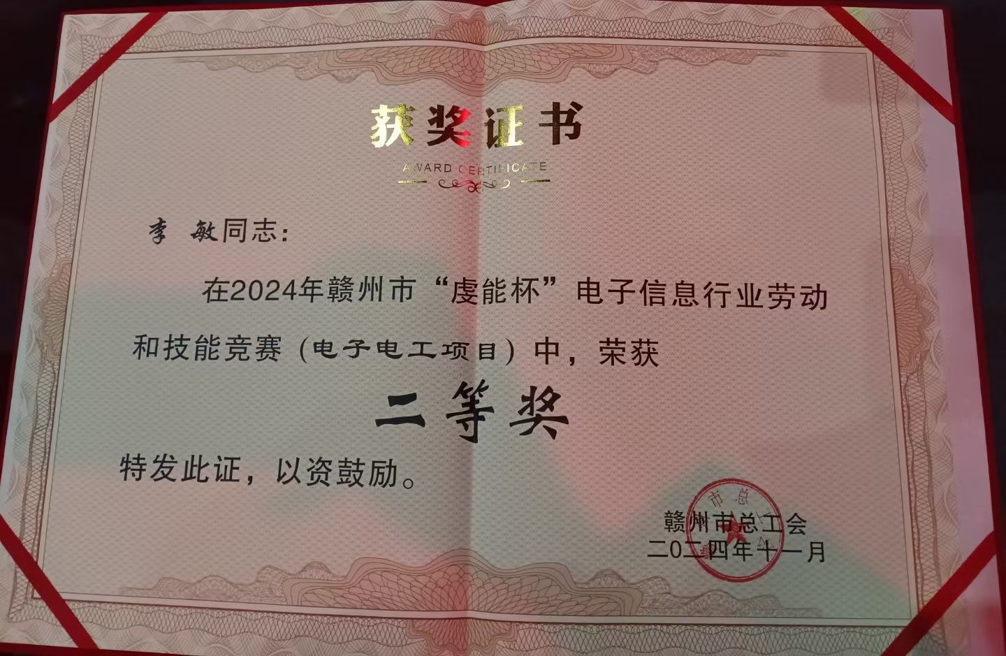 維修部謝信健以優(yōu)越成績獲得2024年贛州市“虔能杯”電子電工技能大賽二等獎;2024江西省“天工杯”電子行業(yè)職工職業(yè)技能競賽獲得優(yōu)勝獎;贛州市總工會“個人勞動模范稱號”表彰。
