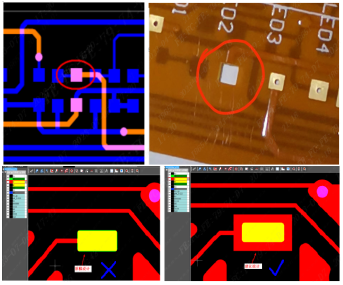 (7)因FPC是使用的阻焊膜不能像綠油一樣做阻焊橋,在設(shè)計(jì)IC類焊盤時(shí),焊盤上不能有多余的覆銅(如下圖圈住的焊盤設(shè)計(jì)不合理),否則會(huì)導(dǎo)致焊盤變大,間距變小,焊接時(shí)容易短路。