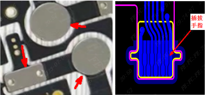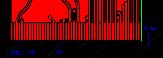 (1)插拔手指:激光切割時(shí)板邊遇高溫碳化導(dǎo)致金手指之間出現(xiàn)微短問題需要把金手指內(nèi)縮0.2mm(一般會(huì)統(tǒng)一內(nèi)縮,有特殊要求需提出來)