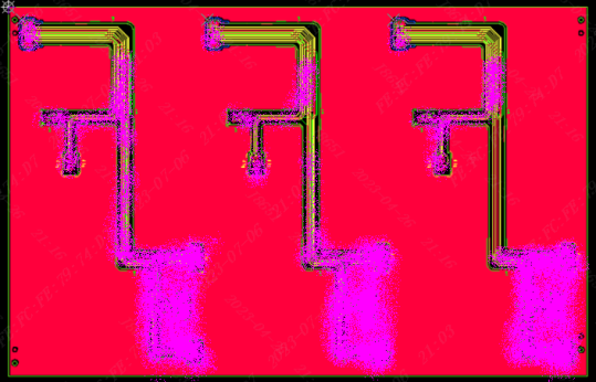 (6)下圖所示,排線線路稀疏,拐角處容易撕裂,建議在板邊增加防撕裂銅條或在背面增加網(wǎng)絡(luò)銅。