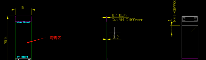 可以隨意彎折是FPC軟板的最大優(yōu)勢,因此它的彎折區(qū)要特別關(guān)注下,這是一個FPC項目中結(jié)構(gòu)工程師給出的一個三視圖圖紙,這是一個副板連接主板的FPC排線,中間部分就是需要彎折的地方。
