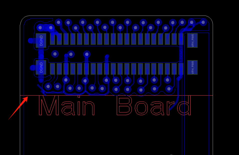 FPC設(shè)計中,對彎折區(qū)的要求很高,第一點就是彎折區(qū)內(nèi)不能打孔,打孔會使彎折區(qū)銅硬度變大,影響彎折的效果和降低FPC壽命。如下圖所示,箭頭所指線以下為彎折區(qū),BTB連接器的換層走線孔必須避開彎折區(qū),不能在彎折區(qū)打孔。
