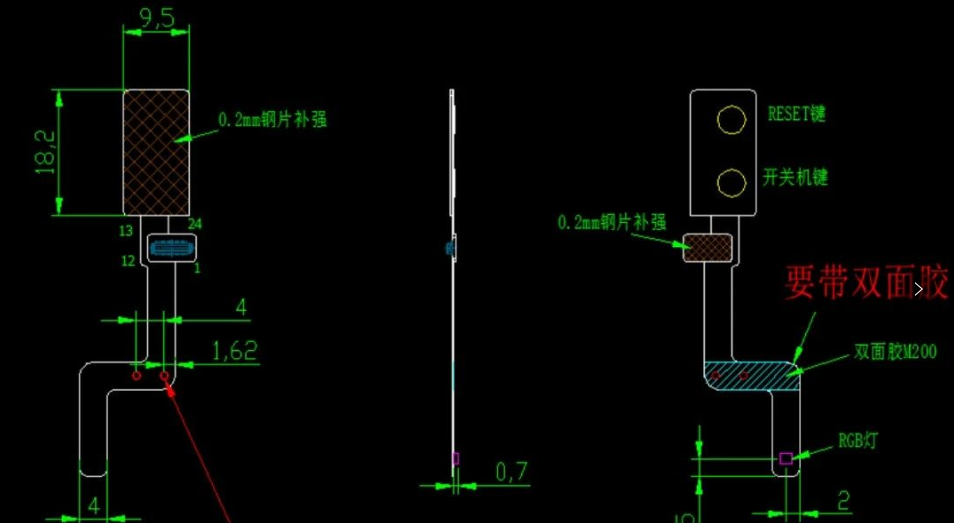 因為FPC軟板很薄,一般雙面板厚度0.08-0.13mm,如果在FPC上貼裝連接器,就需要在連接器下板子的另外一面進行補強,如下圖所示,結(jié)構(gòu)給出的加工圖紙中給出了補強區(qū),在側(cè)鍵和BTB連接的背面使用0.2mm的鋼片進行補強設(shè)計。
