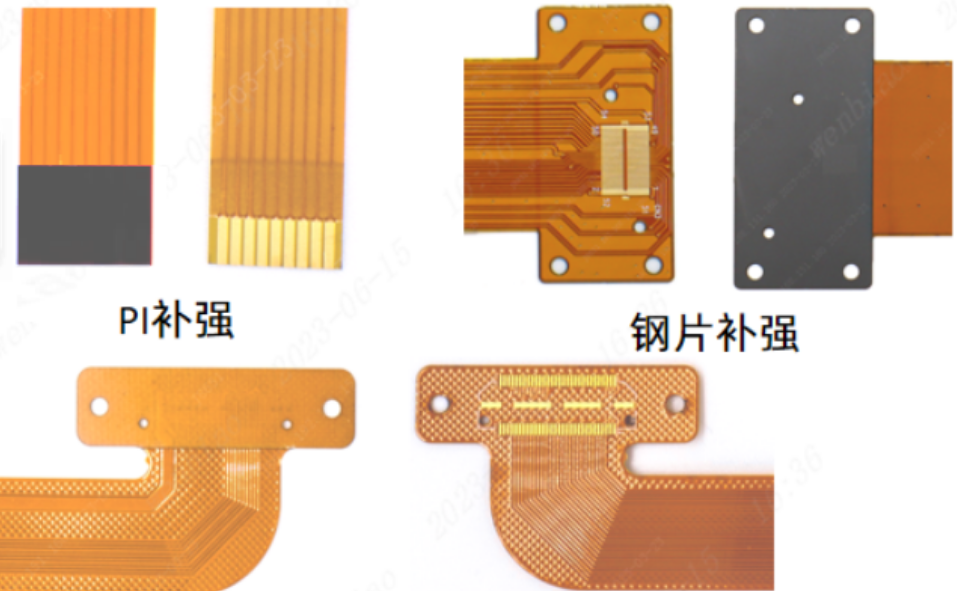 軟板廠FPC補強的材質(zhì)一般有PI、FR4和鋼片3種,如下圖所示,補強區(qū)一般在金手指、按鍵或連接器的背面,對補強區(qū)的要求就是不能放置元器件和絲印文字等,比如絲印文字,補強后文字就被遮擋了。
