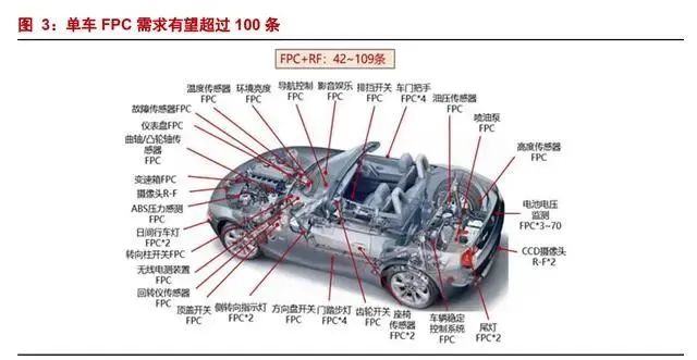 隨著汽車電動(dòng)化、智能化發(fā)展,F(xiàn)PC 在彎折性、減重、自動(dòng)化程度高等優(yōu)勢(shì)進(jìn)一步體 現(xiàn),F(xiàn)PC 在車載領(lǐng)域的用量不斷提升,應(yīng)用涵蓋車燈、顯示模組、BMS/VCU/MCU 三大 動(dòng)力控制系統(tǒng)、傳感器、高級(jí)輔助系統(tǒng)等相關(guān)場(chǎng)景。戰(zhàn)新 PCB 產(chǎn)業(yè)研究所預(yù)計(jì)單車 FPC 用量將超過(guò) 100 片。尤其新能源汽車的大發(fā)展帶動(dòng)車載動(dòng)力電池用 FPC 需求大幅增長(zhǎng)。