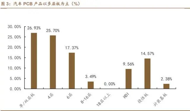 汽車(chē) PCB 品類(lèi)需求多元化,以為主。汽車(chē)對(duì)于 PCB 的要求是多元化 的,單雙面板、4 層板、6 層板,8-16 層板分別占比 26.93%、25.70%、17.37%, 合計(jì)占比約 73%,HDI、FPC、IC 載板占比分別為 9.56%、14.57%、2.38%, 合計(jì)占比約 27%,可見(jiàn) PCB 多層板仍是汽車(chē)電子的主要需求。車(chē)載 PCB 需求以 2-6 層板為主,在整車(chē)電子裝置成本中的占比約為 2%左右。