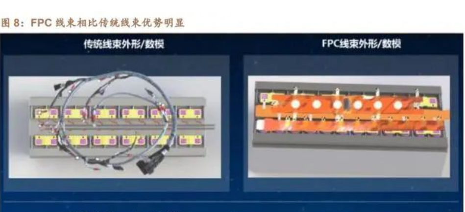 動(dòng)力電池用 FPC:FPC 替代銅線線束趨勢(shì)明確,PCB 單車(chē)價(jià)值約 600 元。采集線是新能源汽車(chē) BMS 系統(tǒng)所需配備的重要部件,實(shí)現(xiàn)監(jiān)控新能源動(dòng)力 電池電芯的電壓和溫度;連接數(shù)據(jù)采集和傳輸并自帶過(guò)流保護(hù)功能;保護(hù)汽車(chē)動(dòng) 力電池電芯,異常短路自動(dòng)斷開(kāi)等功能。此前新能源汽車(chē)動(dòng)力電池采集線采用傳 統(tǒng)銅線方案,空間擠占大,Pack 裝配環(huán)節(jié)自動(dòng)化程度低。相較銅線線束,F(xiàn)PC 由于其高度集成、超薄厚度、超柔軟度等優(yōu)點(diǎn),在安全性、輕量化、布局規(guī)整等 方面具備優(yōu)勢(shì)。