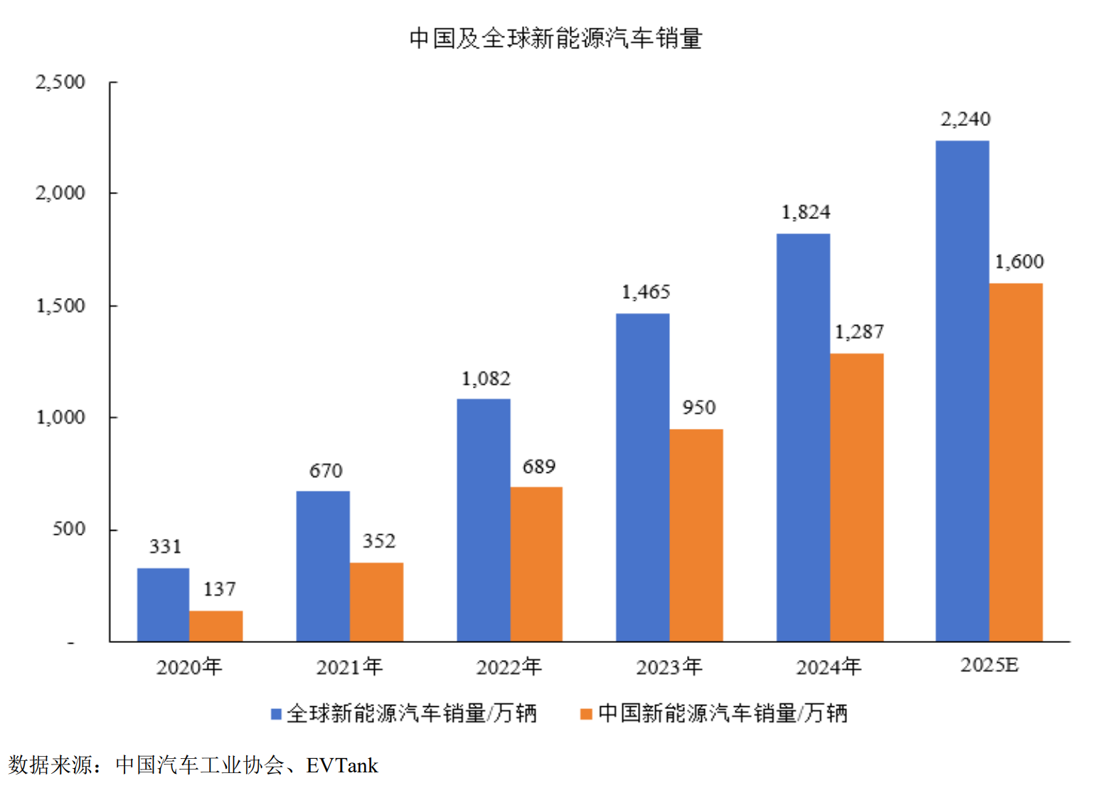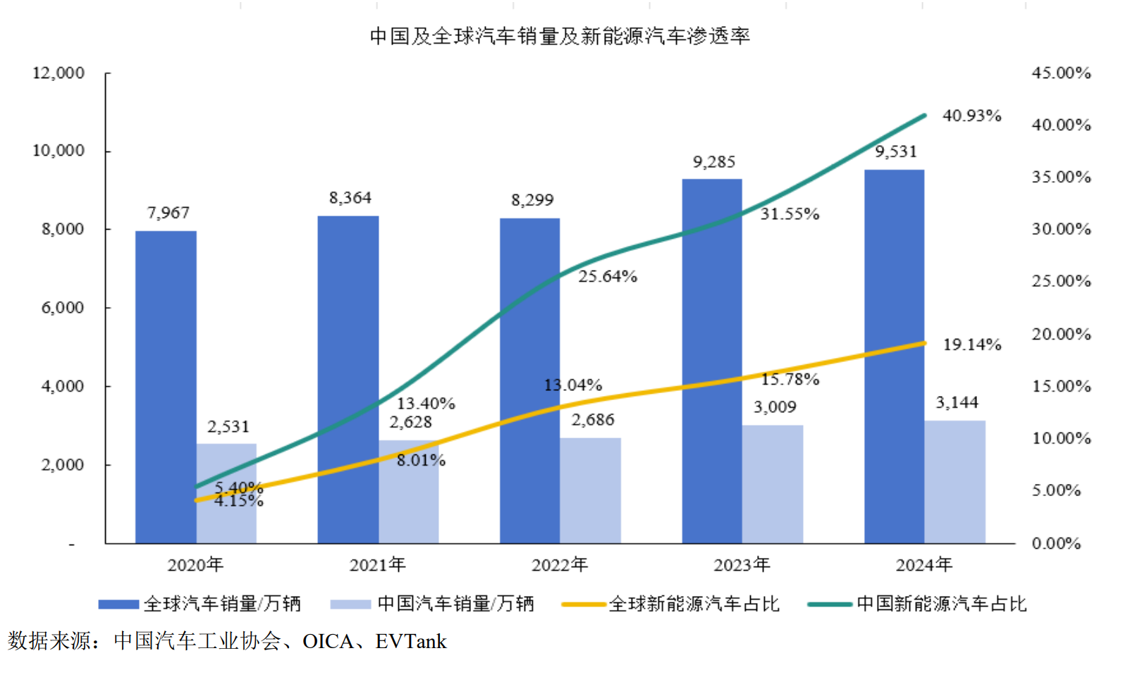2024年度,全球及中國汽車銷量分別為9,531萬輛和3,144萬輛,同比分別增長2.6%、4.5%,全球及中國新能源汽車產(chǎn)銷分別為1,824萬輛、1,287萬輛,同比分別增長24.5%、35.5%,繼續(xù)保持快速增長,新能源汽車銷量占汽車總銷量的比例分別達(dá)到19.1%、40.9%,中國成為引領(lǐng)全球汽車產(chǎn)業(yè)轉(zhuǎn)型的重要力量。